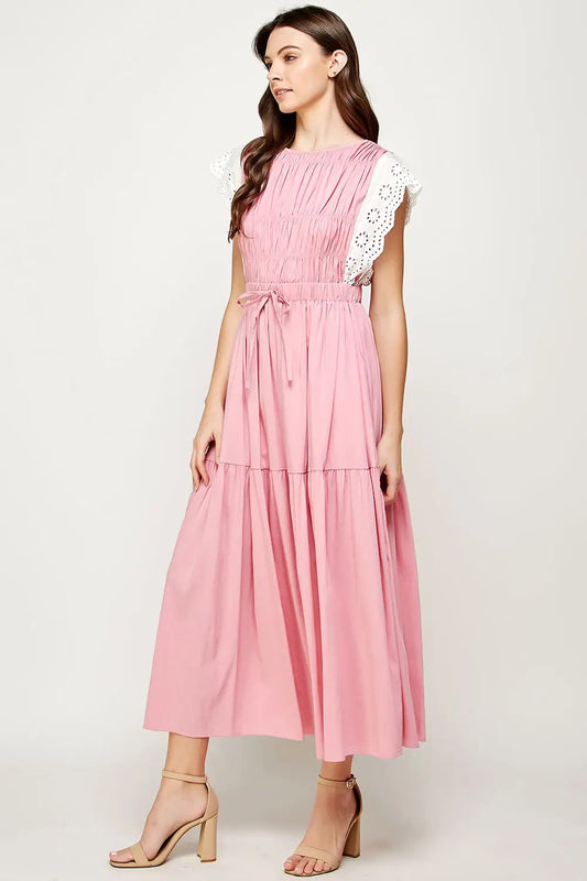 Pink Eyelet Trim Tiered Midi Dress