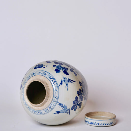 Blue & White Porcelain Bird and Flower Round Storage Jar