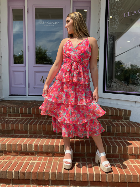 Bright Flowy Tiered Rose Coral Maxi Dress