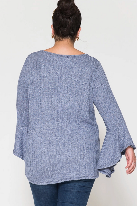 Blue Keyhole Two Tone Bell Sleeve Curvy Fit Top
