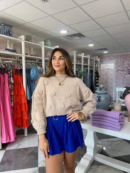 Beige Pom Pom Daisy Knit Cropped Sweater