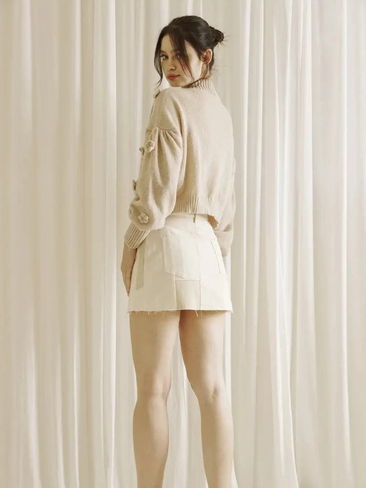 Beige Pom Pom Daisy Knit Cropped Sweater