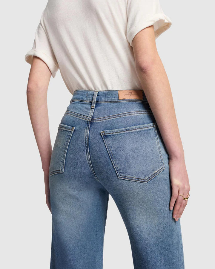 The Ultra High Rise Jo features a high rise and a cropped wide leg. This pair is cut from our buttery-soft Luxe Vintage denim that feels like your favorite pair of broken-in jeans. The faded blue wash has heavy sanding down the thighs to add to the lived-in effect.