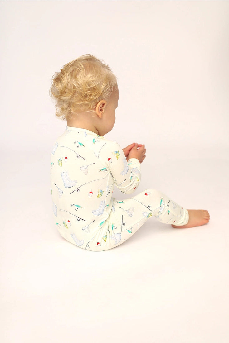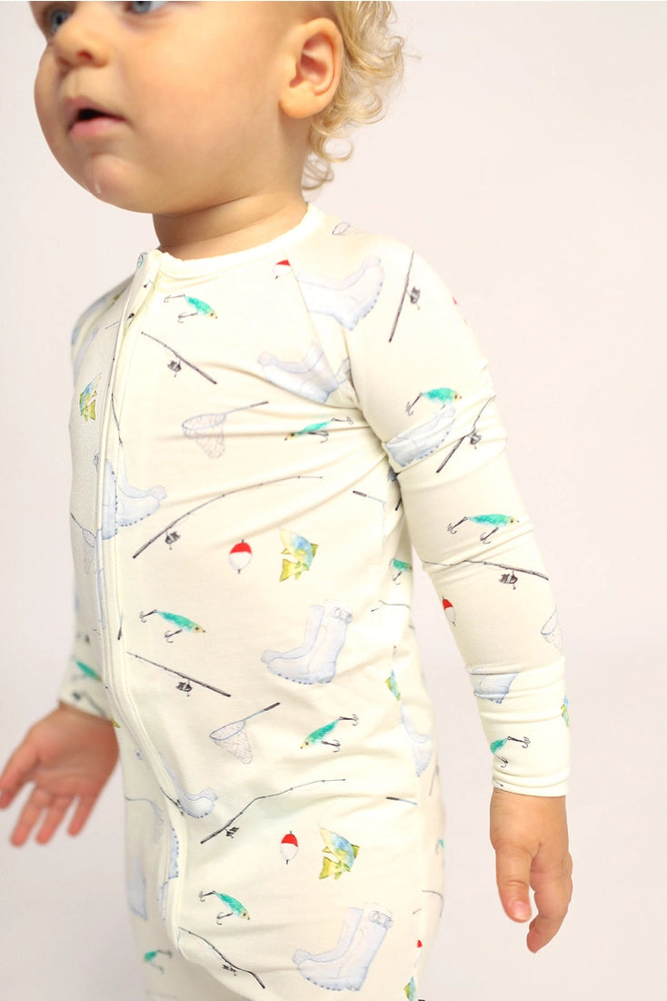 Our double zipper sleepers are made of the softest material - viscose from bamboo! So gentle on skin and perfect for any season, which is great because these sleepers last much longer than your average pajamas due to bamboos amazing stretch abilities. Our Fishing Pattern was created to be a gender neutral classic design that's sure to become a bedtime staple for your little! MORE ABOUT FUNCTION AND FABRIC: * Fold-over mittens in all sizes to protect your little ones from scratching themselves * Fold-over foot cuffs on all sizes to effortlessly convert from footless romper to footed sleeper * Double zipper that makes for quick and easy diaper changes * No snaps, buttons, or interior tags * 95% viscose from bamboo; 5% spandex * Machine wash cold