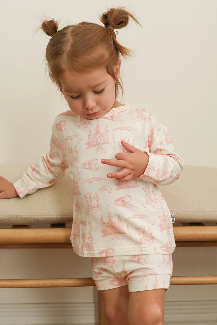 Our bamboo Sweatshirt Set makes the perfect outfit for littles playing in our mild southern winters! This classic style features our thickest bamboo material in coordinating sweatshirt & bottoms. Our Pink Toile pattern was created to be a gender neutral classic design that's sure to become a cool weather staple for your little!