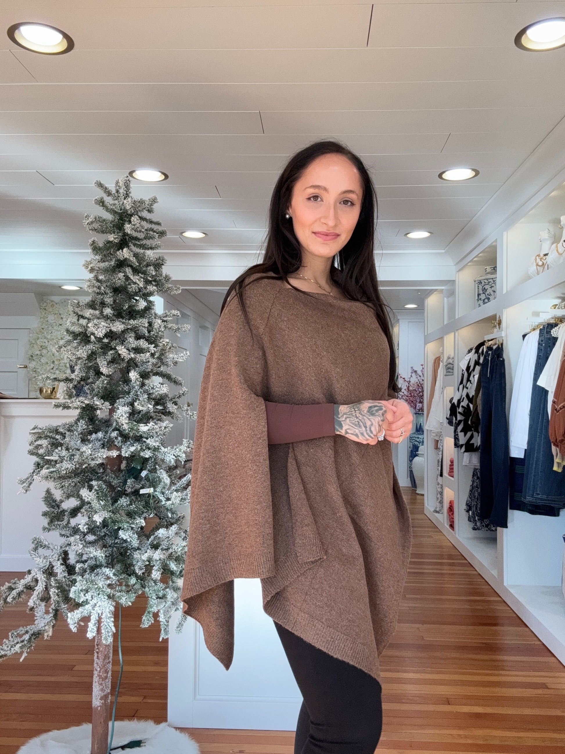 Stay warm in style with this asymmetrical poncho sweater featuring a chic boat neckline and soft drape. Designed for layering with a relaxed fit and subtle back slit, it's the perfect lightweight outer layer for transitional weather.