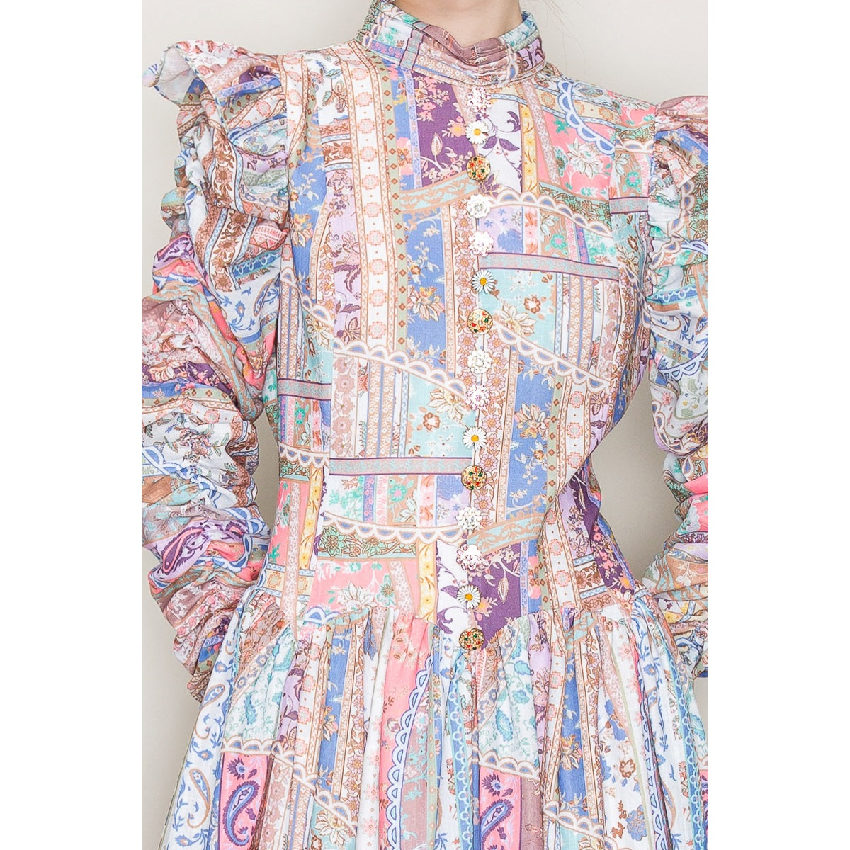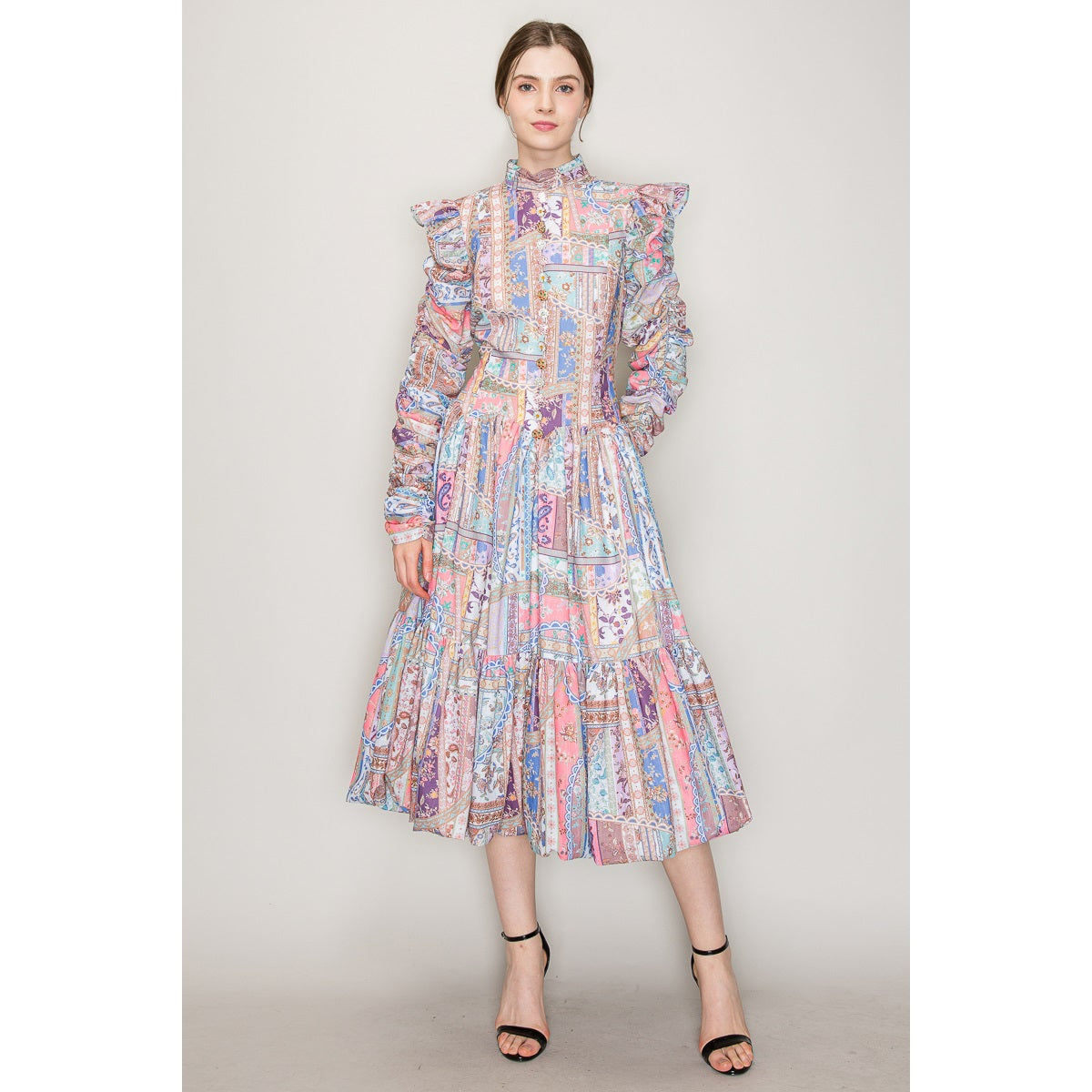 Multi Print Floral Buttons Ruched Sleeves Midi Dress Make a style statement with this Long-Sleeve dress. Perfect for a Fall wedding or any other occasion you have.