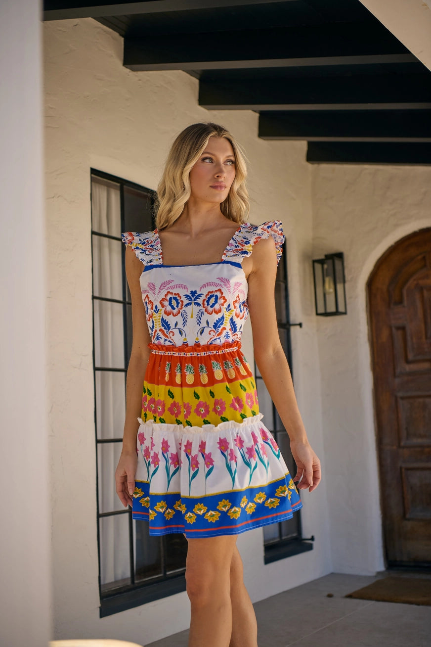 Wherever your adventures take you, the Floral Ruffle Tiered Mini Dress will always make sure you do it in style! A unique floral print overlays all over this mini dress with ruffle tiered layers and sleeveless style. Ruffles on the shoulder straps give it that extra fluff. A smocked back and straps are stretchy. Add on your orange strappy heels to go along this dress! - Ruffles - Square neck - Drawstring waist - Smocked back - Color: White multi