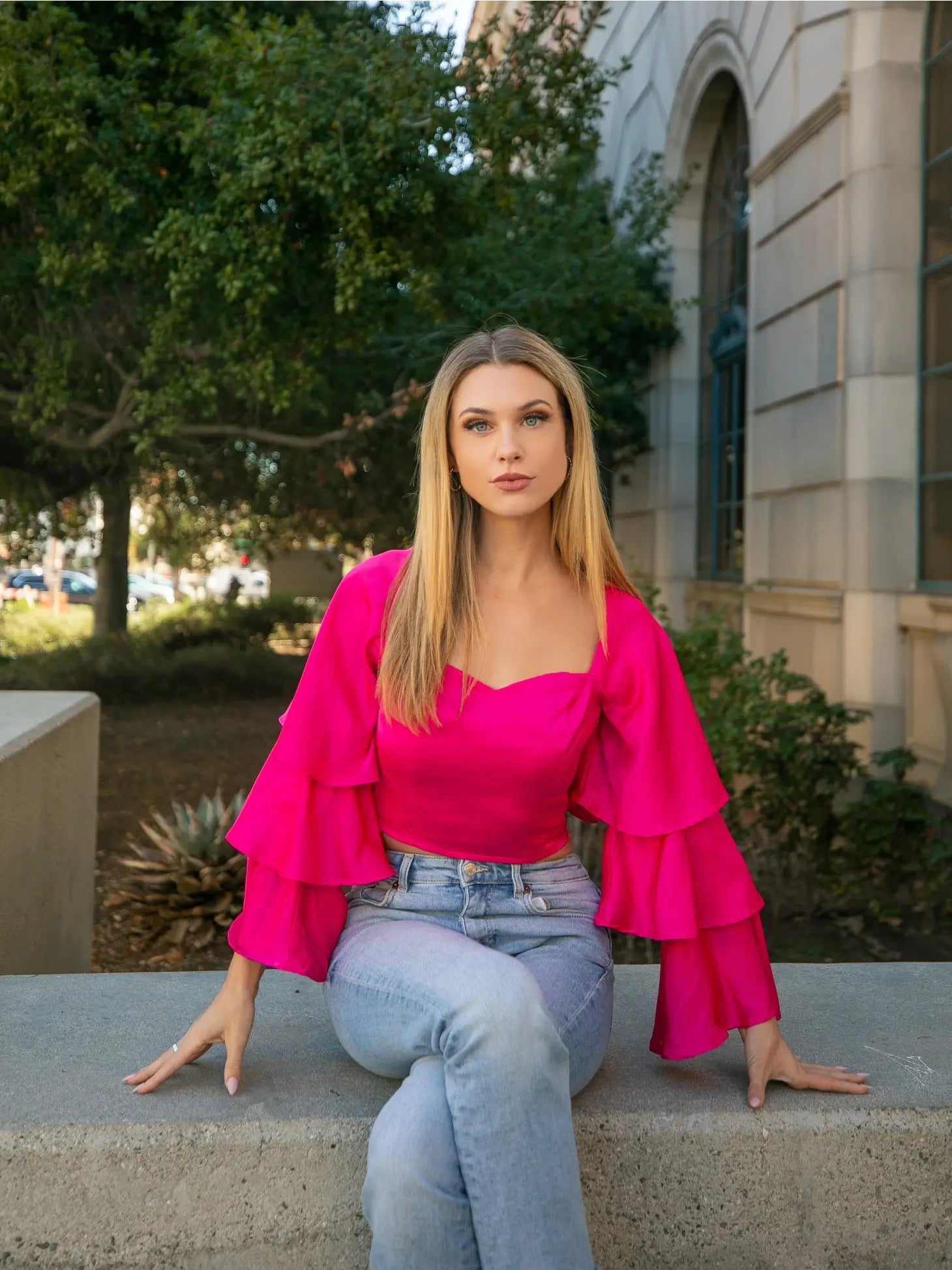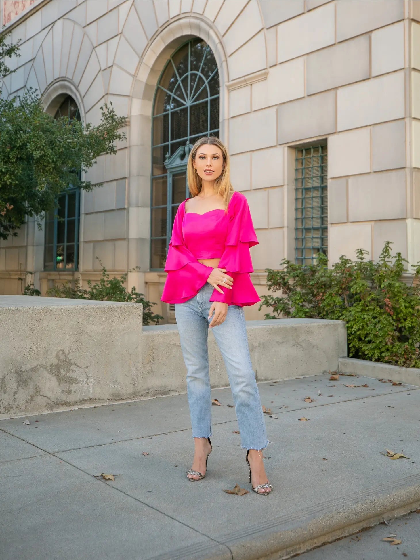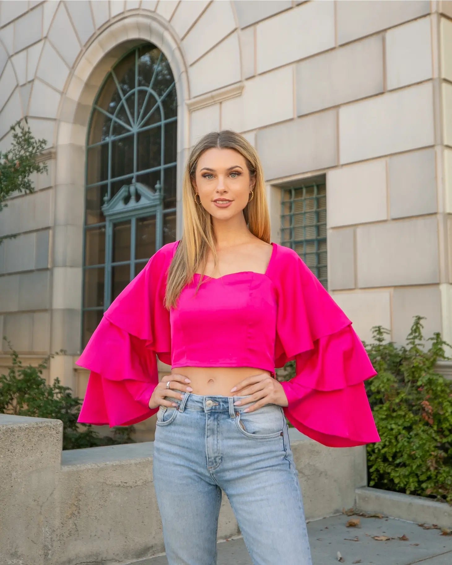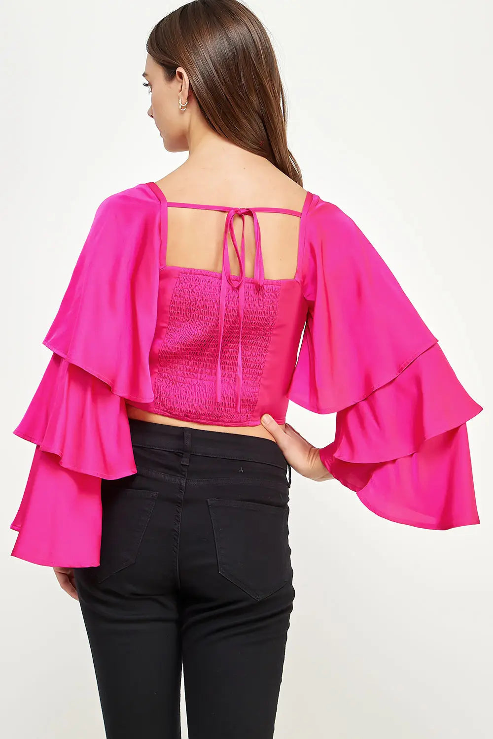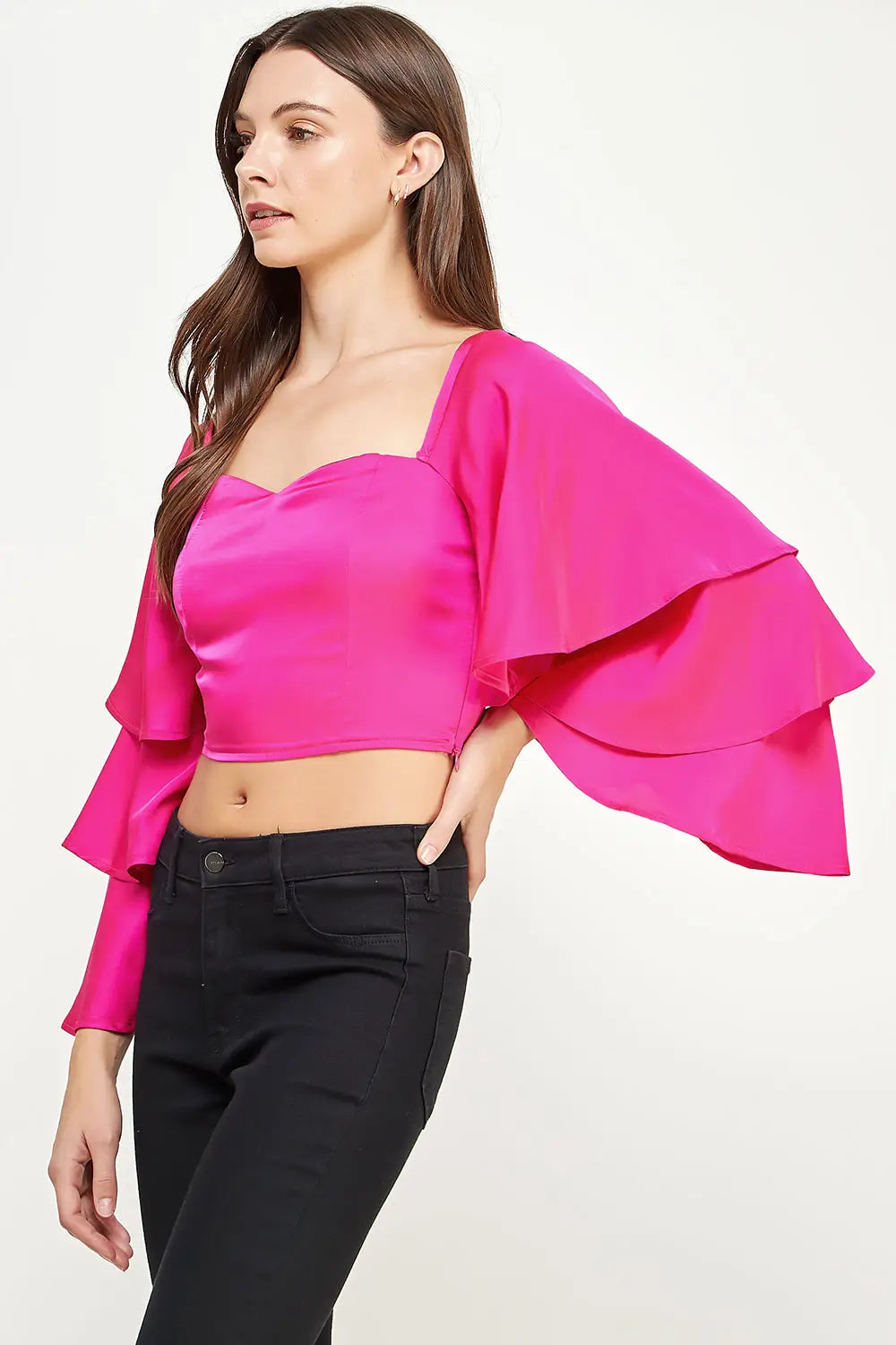 Fuchsia Trumpet Sleeve Satin Crop Top Blouse