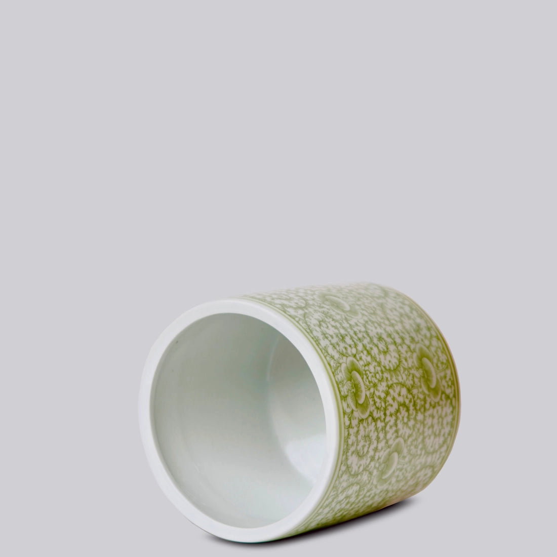 Cobalt Guild offers an assortment of blue and white porcelain vessels from the antiques markets of Jingdezhen, a town long distinguished by imperial patronage. This piece is a porcelain cachepot with a unique, soft green scrolling peony motif. 7 3/4” x 7 1/4”