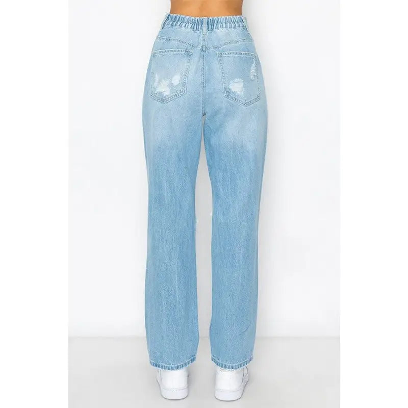 Medium wash high waisted baggy straight leg jeans with distressing and holes at the knee. Super cute and stylish! The stretchy waist in the back allows all day comfort, even when sitting. Runs true to size.