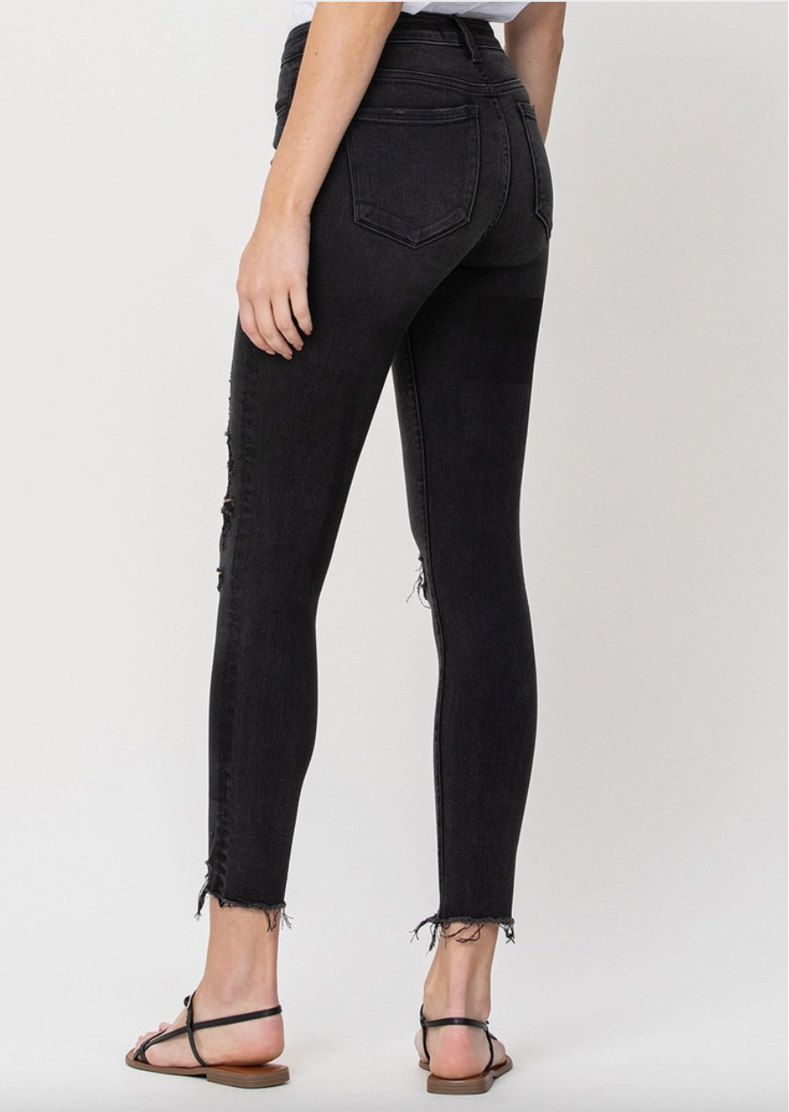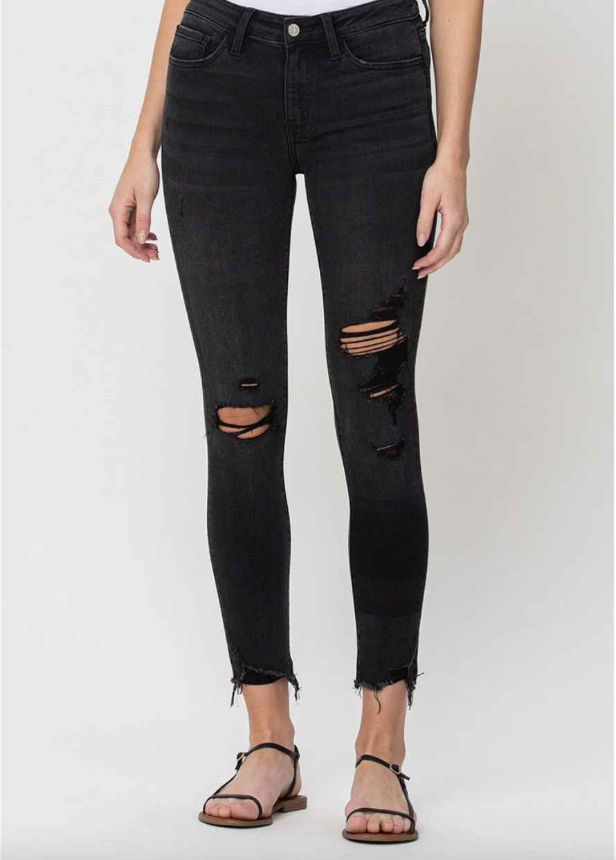 Sassy chic black cropped denim. Perfect amount of stretch. Lightly distressed. Great for everyday wear. RISE: 9" INSEAM: 27" LEG OPEN: 8"