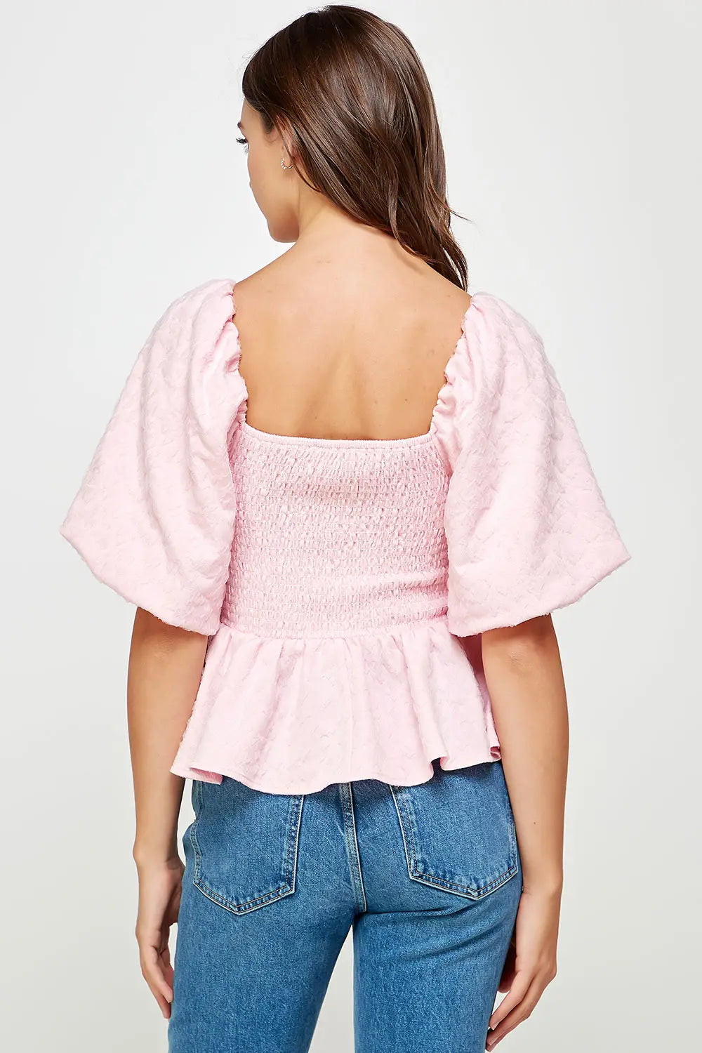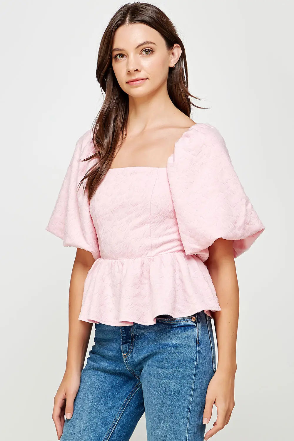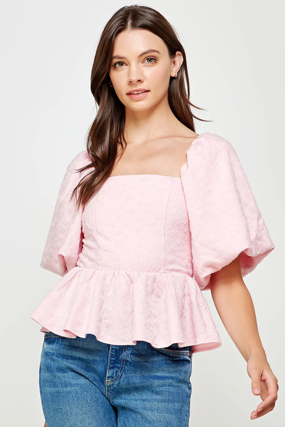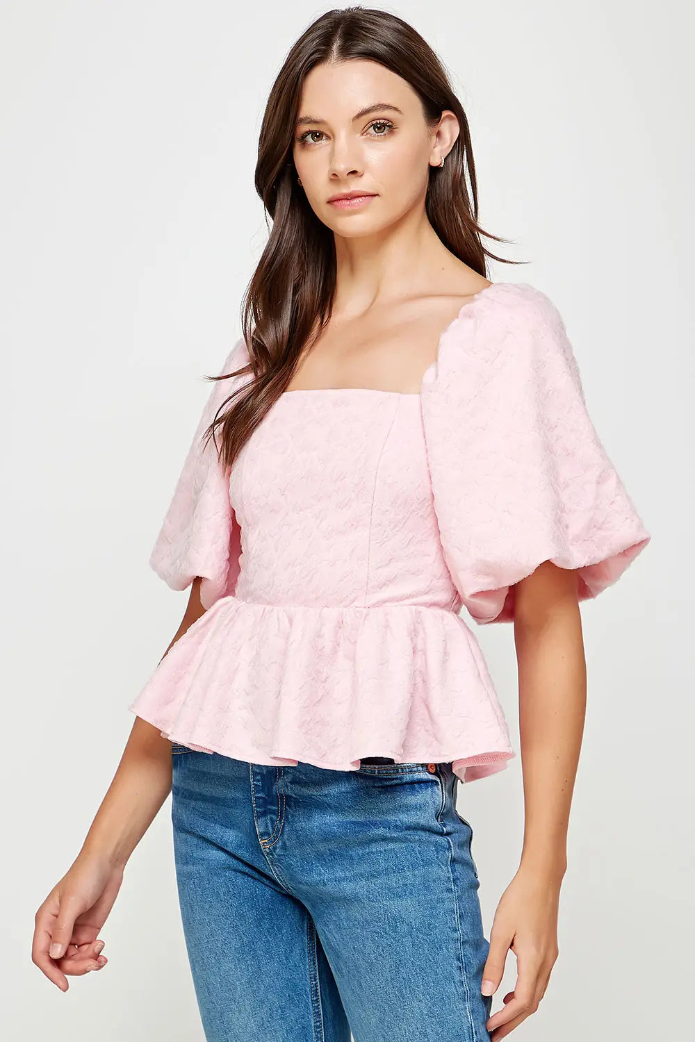 Babydoll peplum blouse in jacquard fabric in stretch textured jacquard knit fabric. This endearing style features a square neckline, puff short sleeves with elasticated cuff, smocking at back for comfort, hidden zipper closure at center back, and elasticated shirred shoulders.