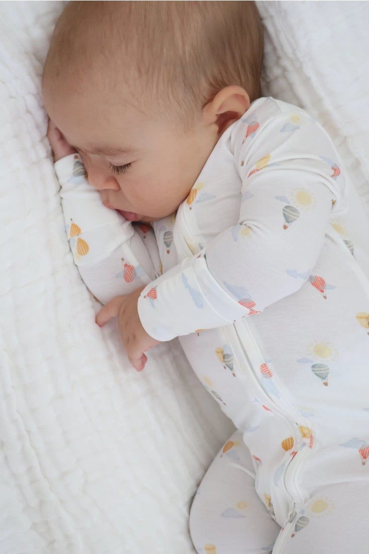 Your baby will float to sleep in this breathable, soft bamboo jumpsuit. This jumpsuit features a whimsical print filled with hot air balloons. The balloons float gently through a bright sky with fluffy clouds and a cheerful sun shining down. This playful design adds a touch of adventure to your little one's everyday wardrobe. 95% Bamboo 5% Spandex Features: * 2-way zipper from neck to foot for easy dressing and changing * Convertible sleeve cuffs